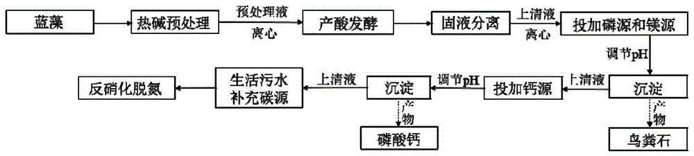 一种用于反硝化外加碳源的制备方法和应用,具体涉及一种回收蓝藻厌氧发酵液中氮磷后作为外加碳源的技术,属于固体有机废物的处理与利用和水处理技术领域。