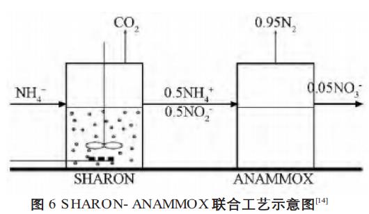 SHARON工艺的基本原理是短程硝化反硝化。该原理与传统硝化反硝化的区别在于将氨氮氧化控制在亚硝化阶段直接进行反硝化,使得反应时间缩短,除磷效果提高。厌氧氨氧化工艺中,由于厌氧氨氧化菌是自氧菌无需外加碳源,大大降低了硝化反应的充氧能耗。因此将SHARON工艺作为硝化反应器,ANAMOX工艺作为反硝化反应器形成组合工艺,工艺图如图6。该工艺适用于处理高氨氮浓度废水,此工艺与传统工艺相比反应时间短,能耗低,产泥量少。