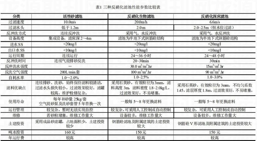 根据三种反硝化滤池的原理和特点,它们的性能参数的比较详见表。